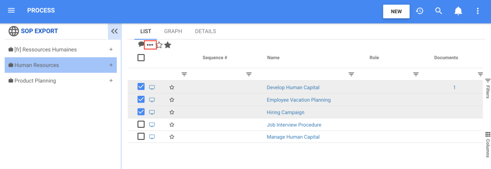 2. Choose 1 or more objects by marking the checkbox of the objects to be edited and select the three-dot icon on the page header.