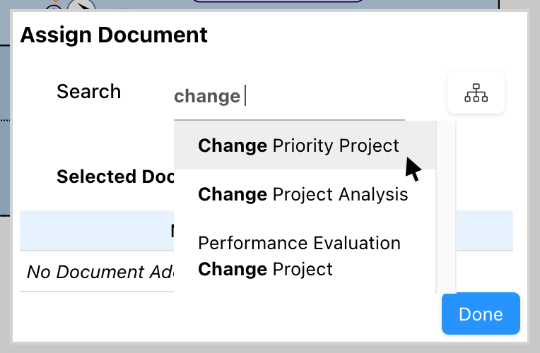 - A pop-up will appear, allowing you to search for the name of the document or asset. Suggestions will populate as you type based on keyword matching.