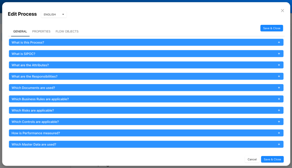 This accordion allows to define the process’ Suppliers, Inputs, Processes, Outputs, and Customers.