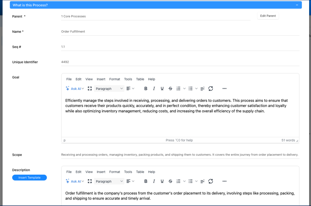 - Goal: The Goal of the process. The rich text format allows for text formatting, images, URLs, tables, etc.