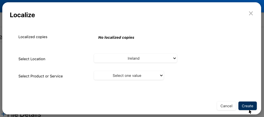 - The creation prompt will appear. Use the Location and/or Product or Service dropdowns to select the appropriate localization values.
