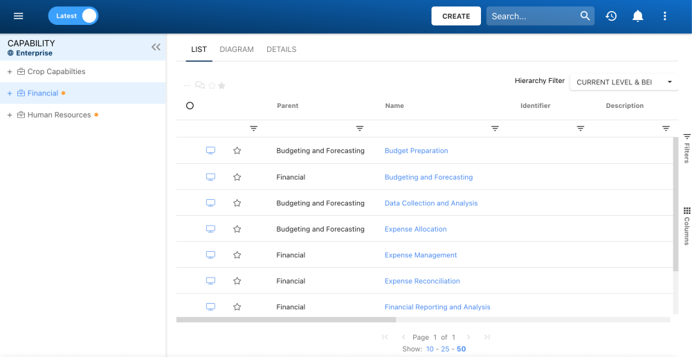 - Current level: A list view where only the first level below the selected Capability is listed.