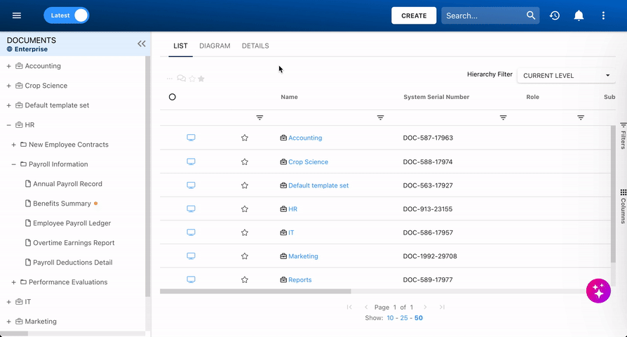 - You can resize the Hierarchy Tree by dragging its right edge. To close it, click the
