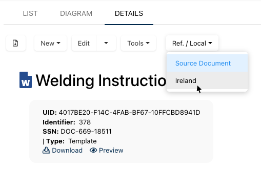 Objects can have multiple localized copies associated with them. Users can easily switch between the source object and its localized copies by using the Ref. / Local dropdown. If no localized copies exist, the dropdown will not be visible.
