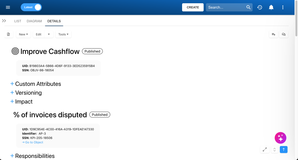 The Details View contains all specific data related to the selected object, which are organized in accordions that can be expanded or collapsed. If users scroll down, they will also have access to the children object’s information. In addition to viewing detailed information, this view allows users to manage objects in various ways, such as creating new objects, editing objects, collaborating with other users, and much more.