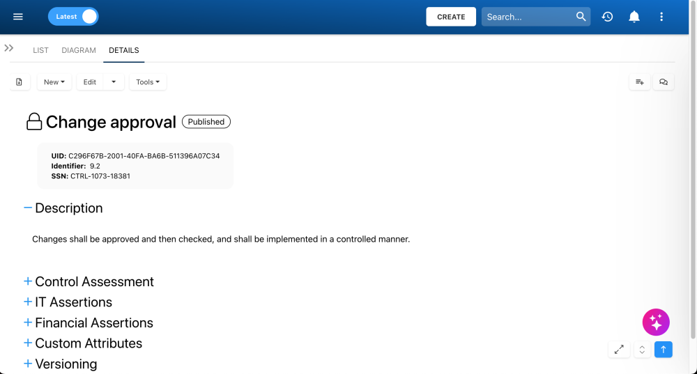 The Details View contains all specific data related to the selected object, which are organized in accordions that can be expanded or collapsed. If users scroll down, they will also have access to the children object’s information. In addition to viewing detailed information, this view allows users to manage objects in various ways, such as creating new objects, editing objects, collaborating with other users, and much more.