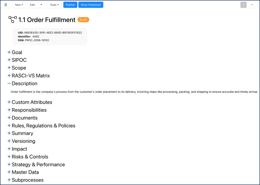 - Scope: A new accordion that allows end-users and analysts to gain a deeper understanding of the process’s scope. Click here for more information about the new Scope field.