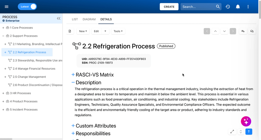 - RASCI-VS Matrix: RASCI-VS Matrix: Now prominently displayed, showing the responsibilities assigned to the process’s flow objects or subprocesses. This accordion was previously nested within the ‘Summary’ accordion. The flow objects present in the matrix are clickable, allowing users to automatically navigate to the flow object within the same Details page.