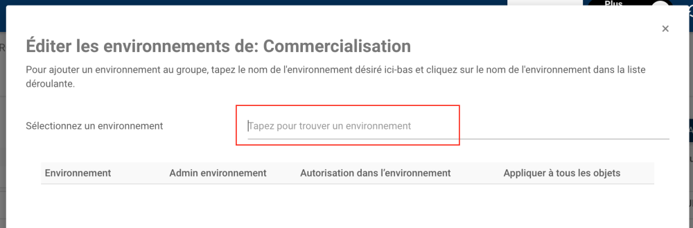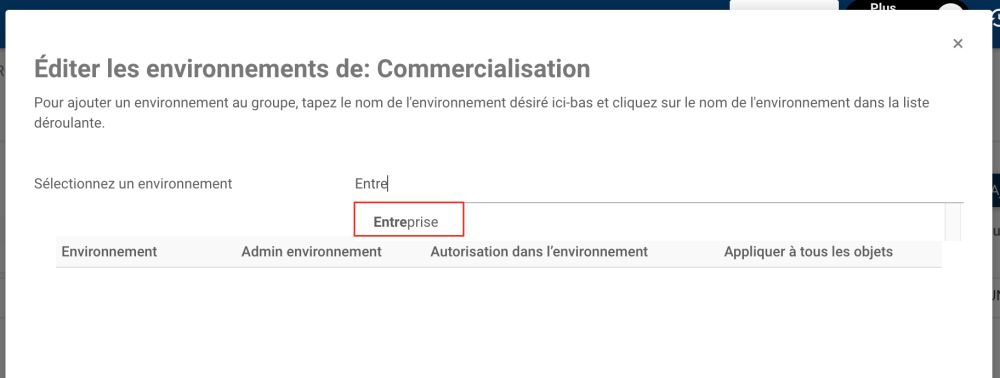 3. Saisissez le nom de l’environnement que vous souhaitez ajouter au groupe. Cliquez sur l’environnement pour finir de l’ajouter