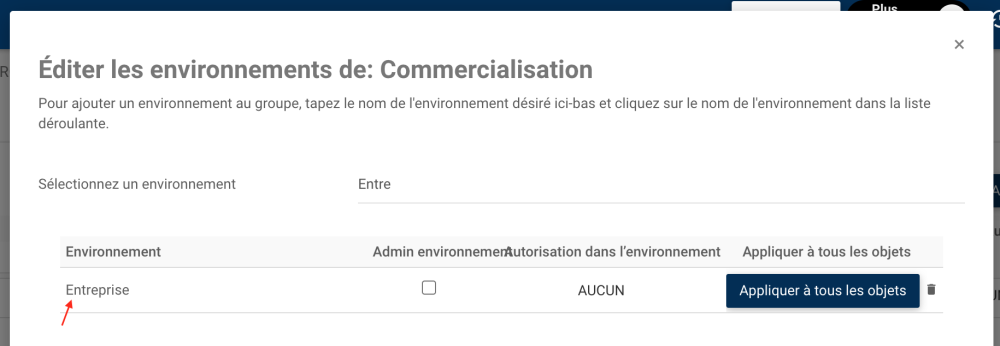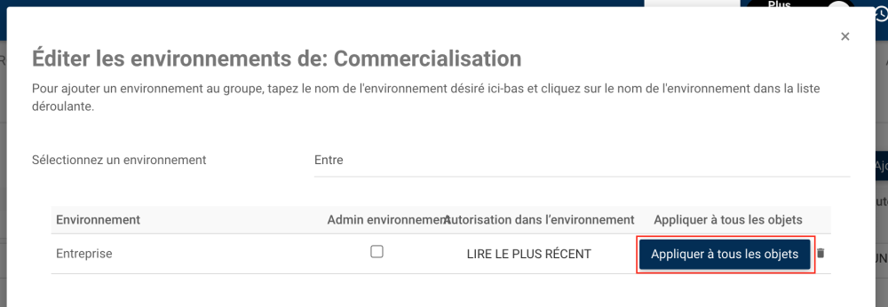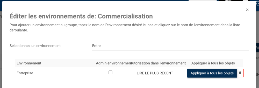 7. Pour supprimer un groupe d’un environnement, cliquez sur l’icône de la corbeille à côté de la case “Appliquer à tous les objets”.