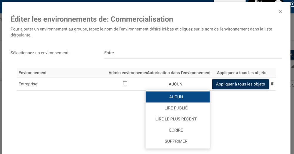 - Aucun : Le groupe n’aura aucune autorisation prédéterminée sur les objets de l’environnement.