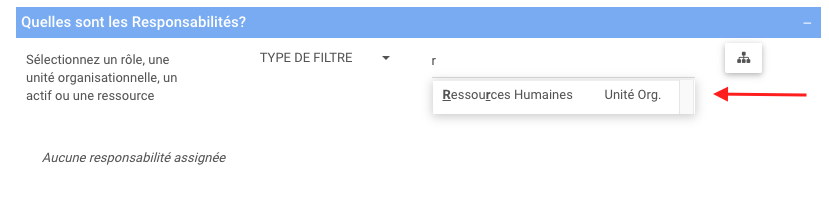 Pour trouver l’unité d’organisation, le rôle, la ressource ou l’actif, commencez à taper le Nom dans la barre de recherche, les résultats seront affinés au fur et à mesure que vous tapez. (Pour cet exemple, l’unité d’organisation Ressources Humaines sera ajouté)
