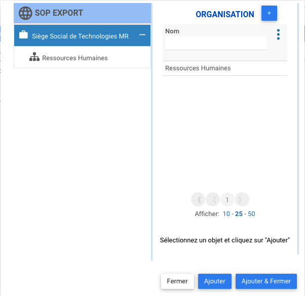 Cette interface réplique l’arborescence hiérarchique des objets dans le module Organisation.