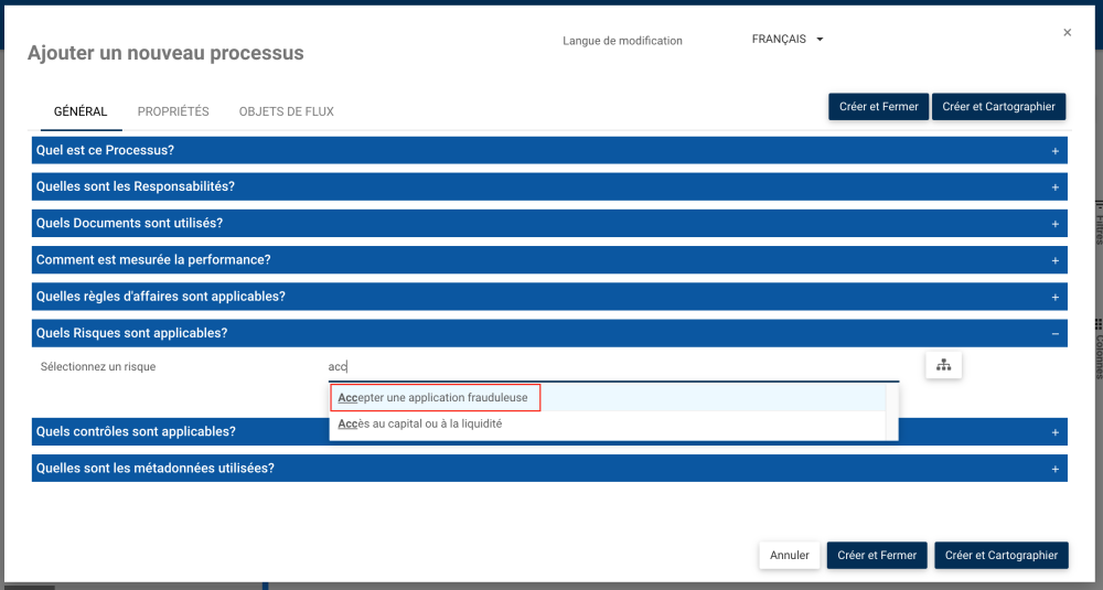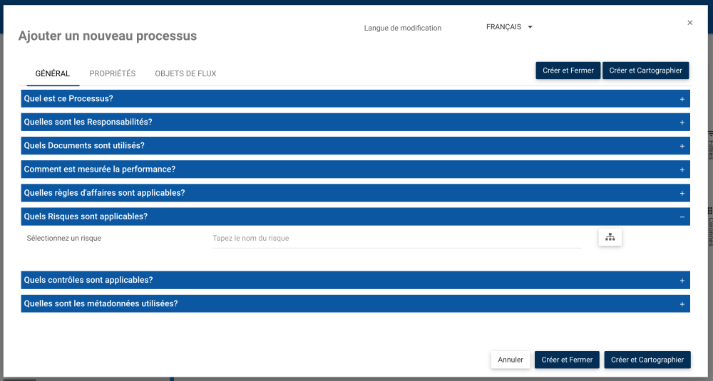 Cette section est disponible sous la forme d’édition des processus ou des objets de flux (tâches, événements et passerelles), des règles, des indicateurs de performance et des risques (en tant que sous-risques).