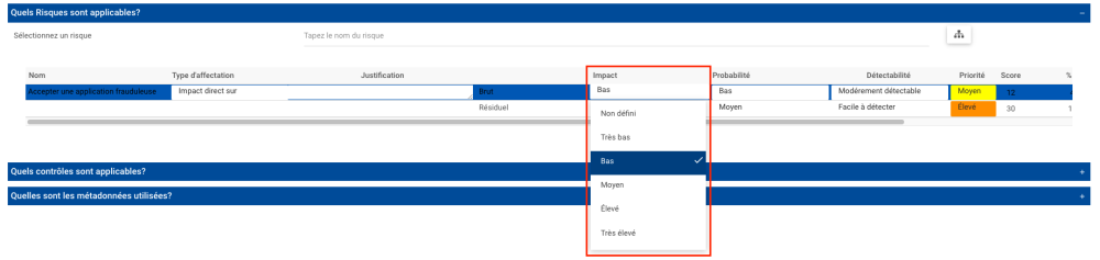 Les risques apparaîtront dans un tableau affichant le nom, le type, l’impact, la probabilité, la détectabilité, la priorité, le score et le % des éléments. Les modélisateurs ont la possibilité de modifier l’analyse des risques bruts et résiduels sans que la modification n’affecte le risque lui-même. Cela garantit que les risques bruts de l’organisation sont plus précis par objet, car un risque peut avoir un impact différent sur des éléments commerciaux distincts.