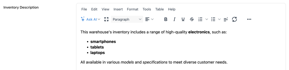 Formatez le texte en utilisant l’éditeur de texte enrichi, avec des options avancées comme gras, italique, couleurs, tableaux, et plus encore.