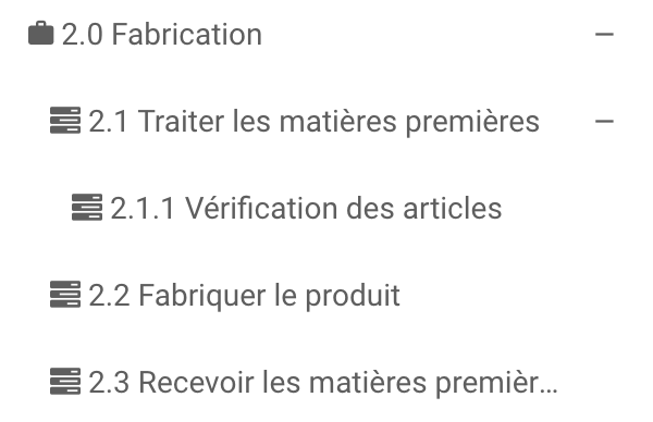 | Processus inclus | 2.0 Fabrication | 2.0 Fabrication 2.1 Traiter les matières premières 2.1.1 Vérification des articles 2.2 Fabriquer le produit 2.3 Recevoir les matières premières |