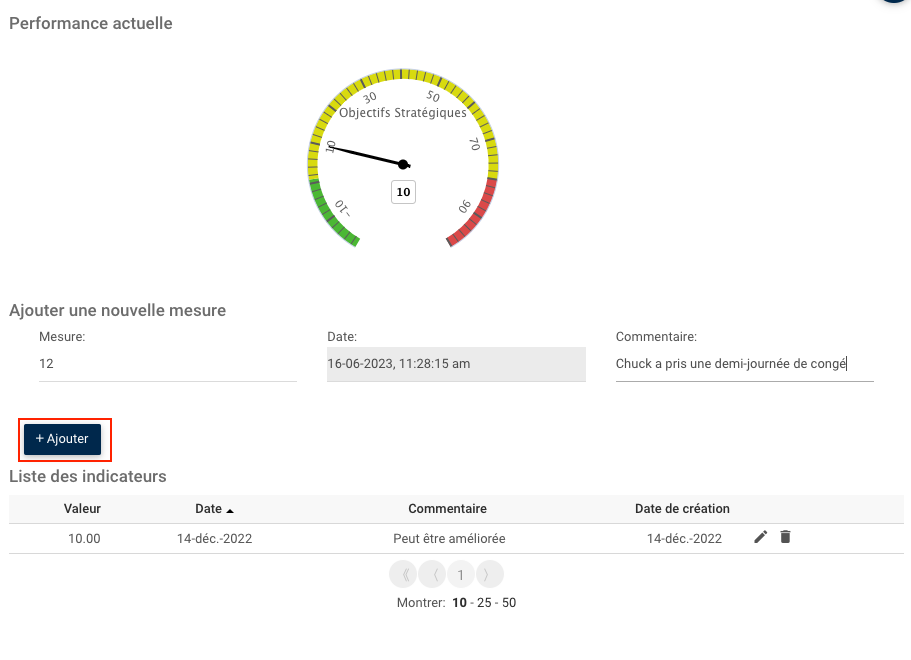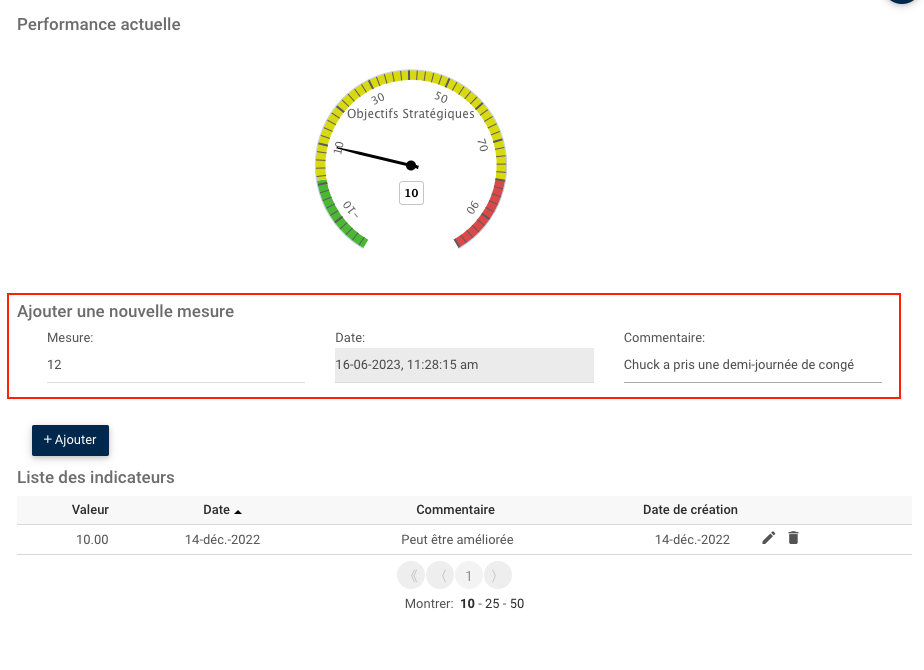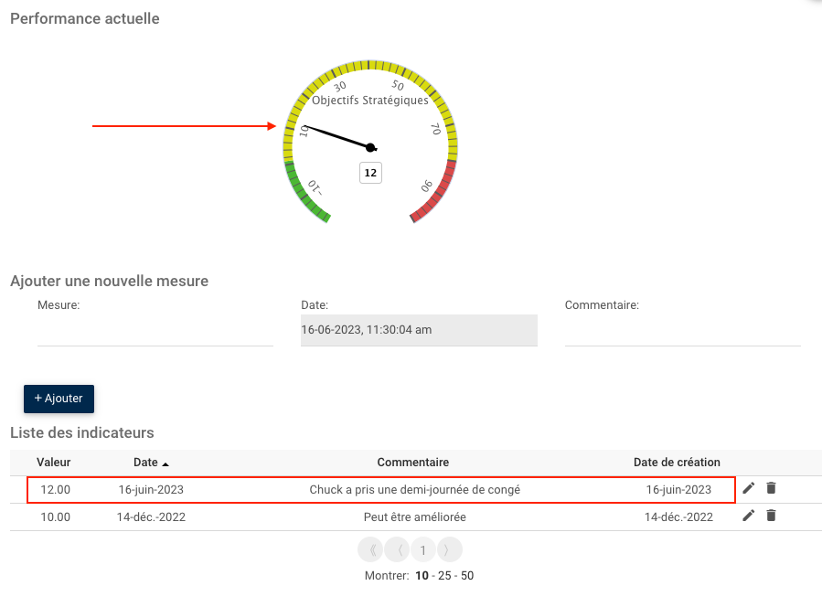 4. La nouvelle valeur sera ajoutée à la « Liste ou indicateurs » et l’indicateur « Performance actuelle » se déplacera en fonction de la mesure que vous avez ajoutée.