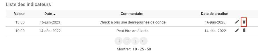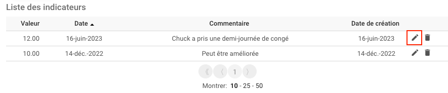 1. Pour éditer une mesure dans la “Liste des Indicateurs”, cliquez sur l’icône du stylo.