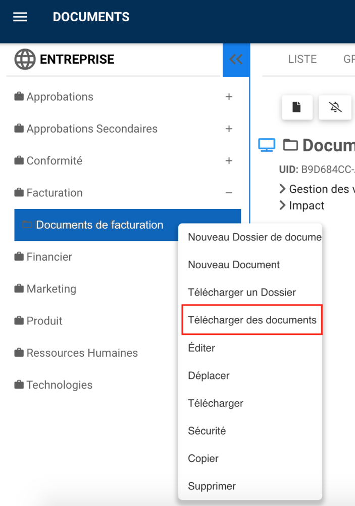 1. Clic droit sur un dossier de documents