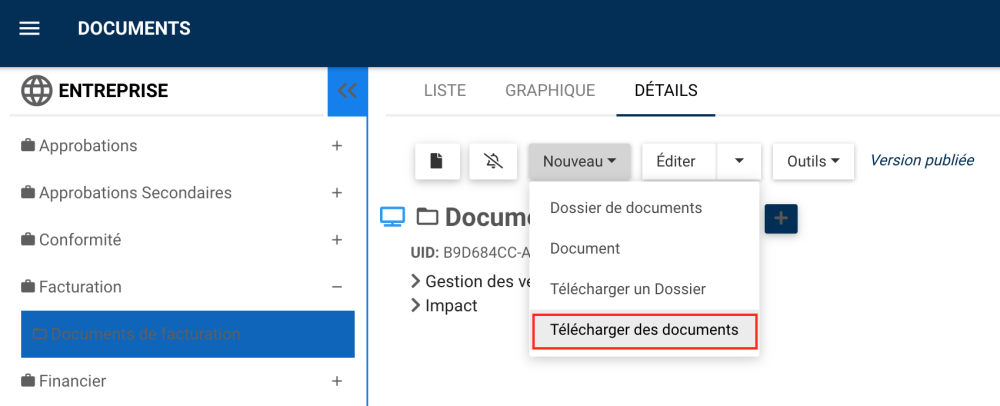 1. Accédez à la page Détails d’un ensemble de documents ou d’un dossier. Cliquez sur le bouton Nouveau et sélectionnez l’action souhaitée.