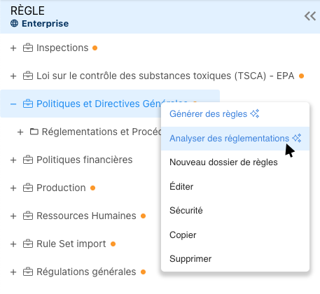 - Dans l’arborescence, faites un clic droit sur l’ensemble ou le dossier souhaité. Les règlements ou contrôles analysés seront imbriqués comme enfants de l’ensemble ou dossier sélectionné.