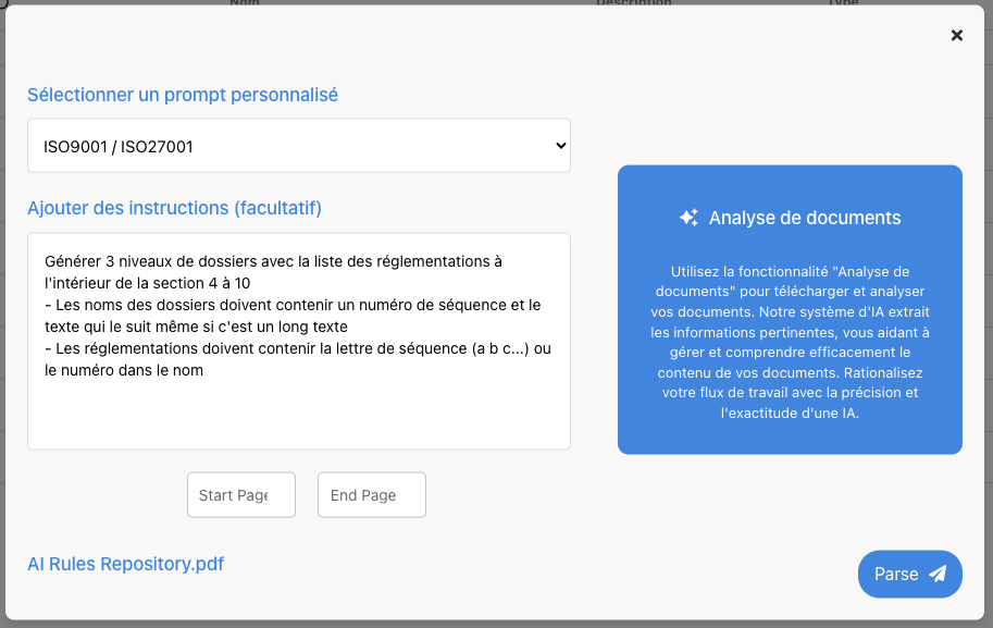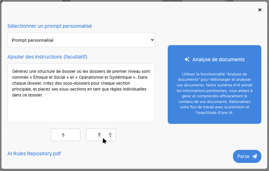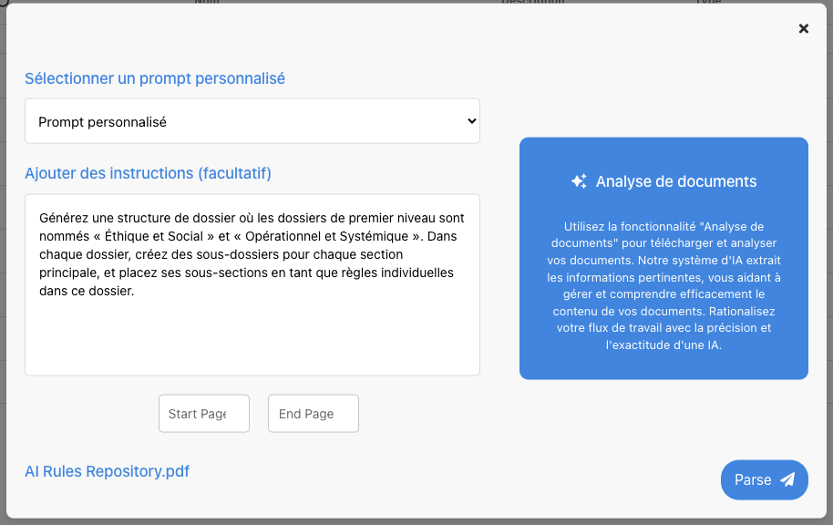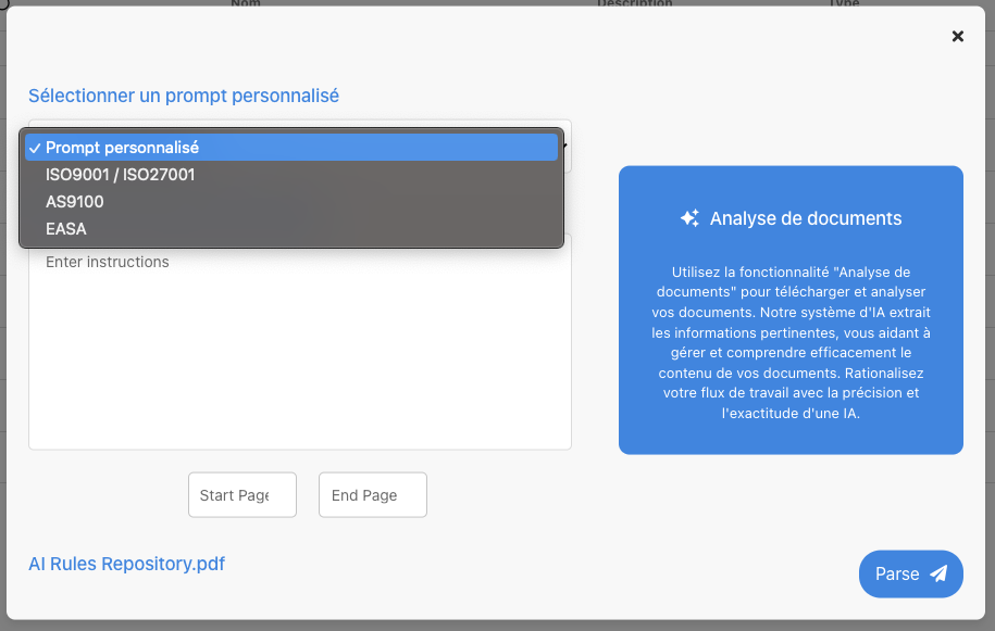 Cette fonctionnalité d’Intelligence Artificielle permet la conversion directe des fichiers réglementaires en règles et contrôles exploitables dans EPC. Cela simplifie l’intégration des exigences réglementaires dans la base de données de l’organisation, éliminant ainsi la nécessité de la saisie manuelle des données ou de l’utilisation de l’application Parser.