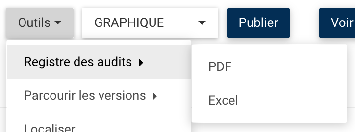 Pour télécharger le registre, naviguez dans l’objet EPC à partir duquel vous souhaitez le télécharger. Sous le bouton Outils, naviguez sur “Registre des Audits” et sélectionnez le format désiré.