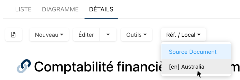 Les objets peuvent avoir plusieurs copies localisées associées. Les utilisateurs peuvent facilement basculer entre l’objet source et ses copies localisées en utilisant le menu déroulant Ref. / Local. Si aucune copie localisée n’existe, le menu déroulant ne sera pas visible.