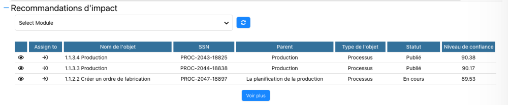 - Bouton Assigner: Uniquement dans le module Règle, ce bouton permet aux utilisateurs d’assigner directement les recommandations à la liste des impacts.