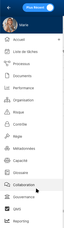 Le Module de Collaboration offre un format listé de tous les éléments avec lesquels un utilisateur est engagé. L’engagement peut inclure des discussions en cours, des questions ou des activités de signalement sur un élément. De plus, il englobe les éléments liés à l’utilisateur (en utilisant la matrice RASCI-VS) qui sont actuellement en cours d’amélioration.
