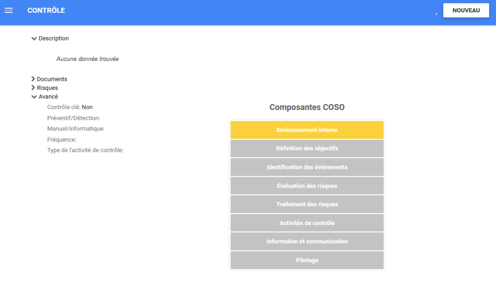 La section Avancé affiche également une table de composants COSO avec ses différentes catégories. Lorsque certains composants sont mis en surbrillance pour un contrôle spécifique, cela signifie que le contrôle est dans cette catégorie. Les utilisateurs peuvent utiliser les composantes du COSO pour organiser et catégoriser les contrôles internes d’une organisation. Elles peuvent appuyer la réalisation de la mission, des stratégies et des objectifs opérationnels connexes de l’entité.