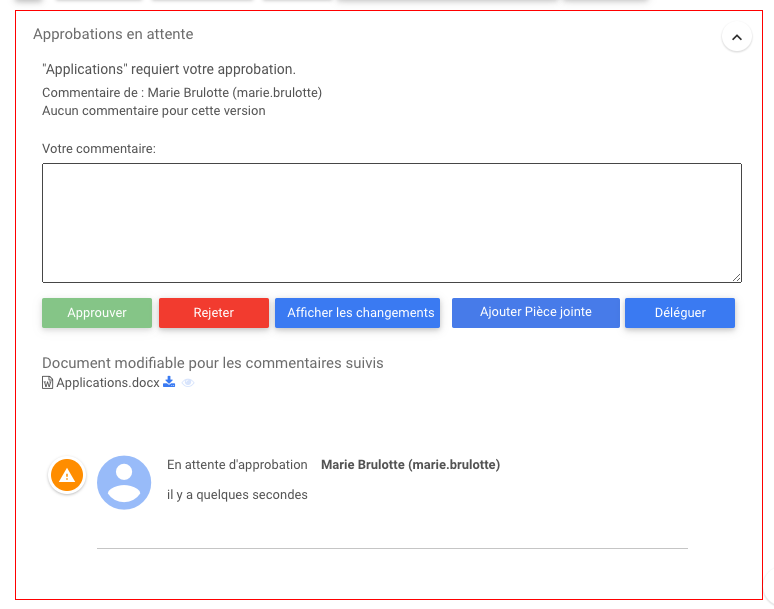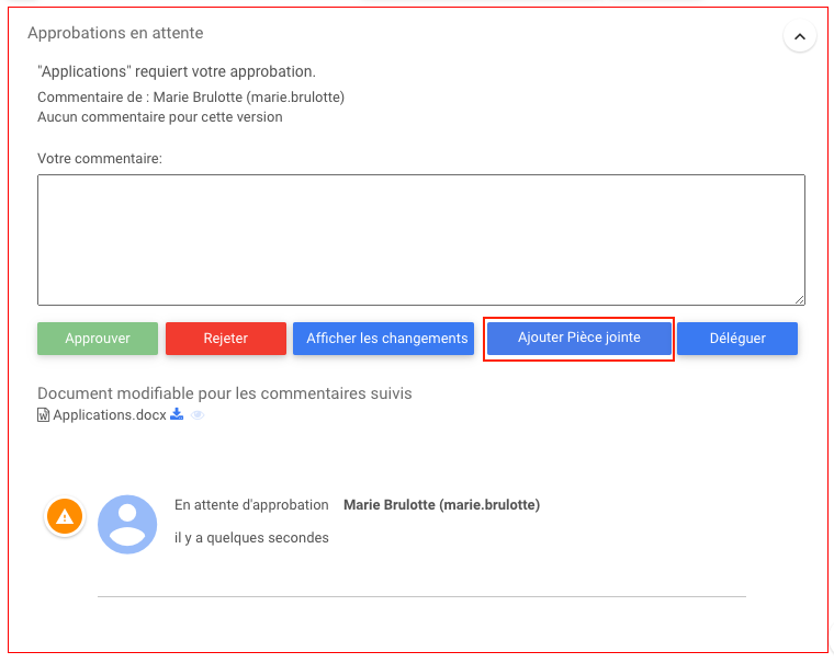 La fonction Ajouter une pièce jointe permet aux utilisateurs de joindre des documents aux approbations pour donner à l’expéditeur autant d’informations que possible sur le rejet ou l’approbation.