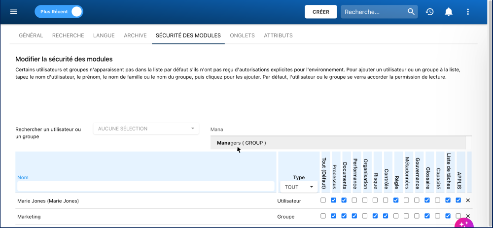 L’onglet Sécurité des Modules ajoute une couche supplémentaire de contrôle et de sécurité que les administrateurs d’environnement et de système peuvent utiliser pour gérer l’accès des utilisateurs et des groupes.