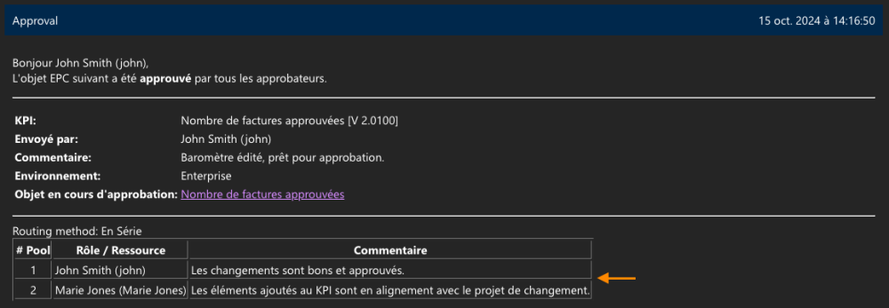L’email envoyé aux utilisateurs une fois qu’un cycle d’approbation ou d’endossement est finalisé contient désormais tous les commentaires fournis par les utilisateurs impliqués dans le cycle, offrant ainsi une vue d’ensemble complète des retours et perspectives de tous les participants.