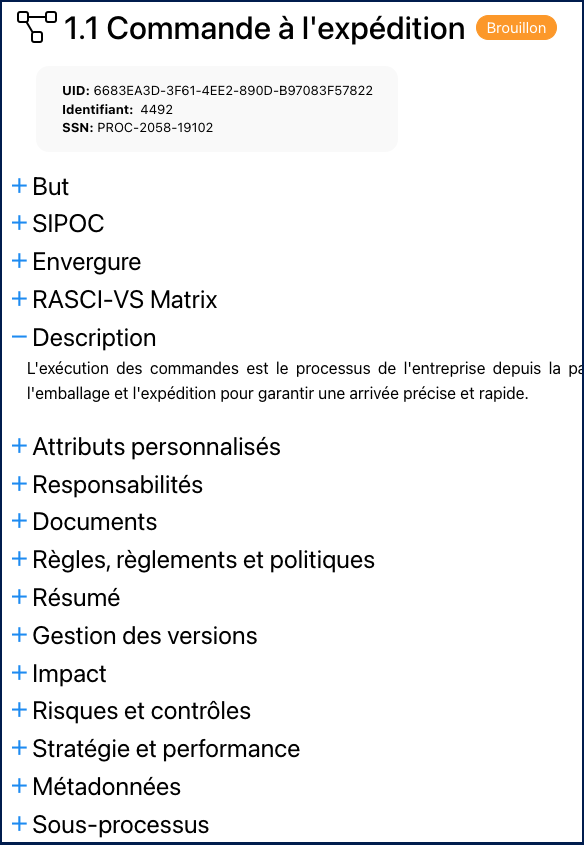 - SIPOC : Cet accordéon a été renouvelé et déplacé vers le haut de la liste pour une meilleure accessibilité. Cliquez ici pour plus d’informations sur le nouveau SIPOC.