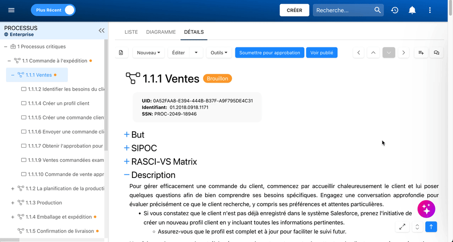- Matrice RASCI-VS : Maintenant affichée de manière proéminente, montrant les responsabilités attribuées aux objets de flux ou sous-processus du processus. Cet accordéon était auparavant imbriqué dans l’accordéon ‘Résumé’. Les objets de flux présents dans la matrice sont cliquables, permettant aux utilisateurs de naviguer automatiquement vers l’objet de flux au sein de la même page de détails.