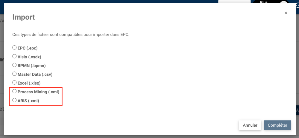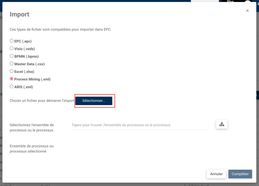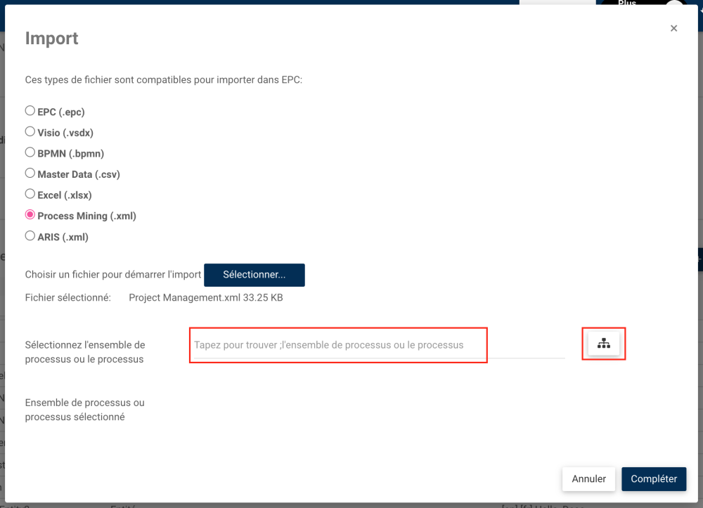 2. Dans la fenêtre d’importation, sélectionnez Process Mining (.xml) pour les fichiers Fluxicon ou ARIS (.xml).