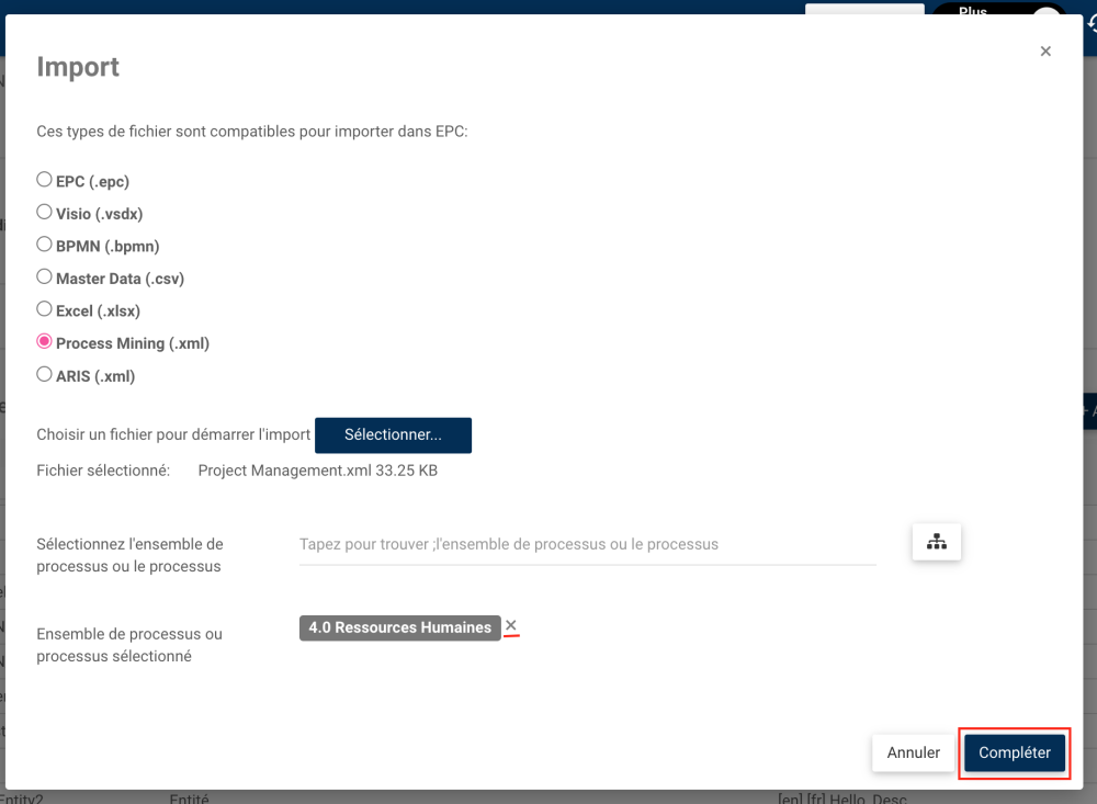 Pour importer des fichiers de Process Mining, suivez les étapes ci-dessous :