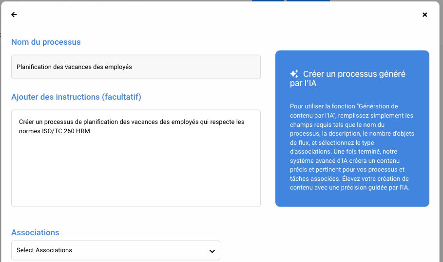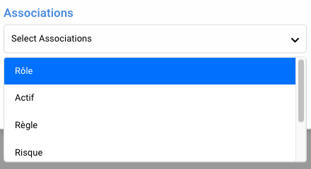 - Dans le menu déroulant Associations, vous pouvez sélectionner les objets que l’Intelligence Artificielle créera et associera au contenu du processus, y compris les rôles, actifs, règles, contrôles, risques et KPI.