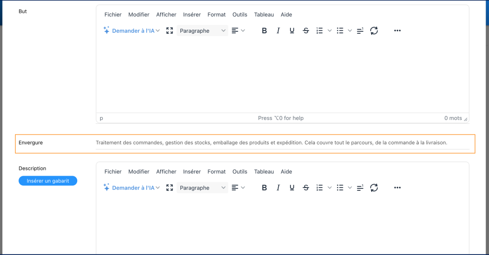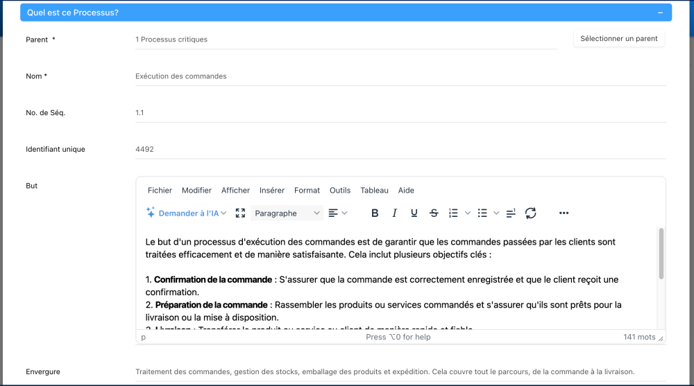 Nous avons introduit un nouveau champ Envergure, conçu pour fournir aux analystes, aux gestionnaires et aux dirigeants une compréhension complète de la portée du processus.