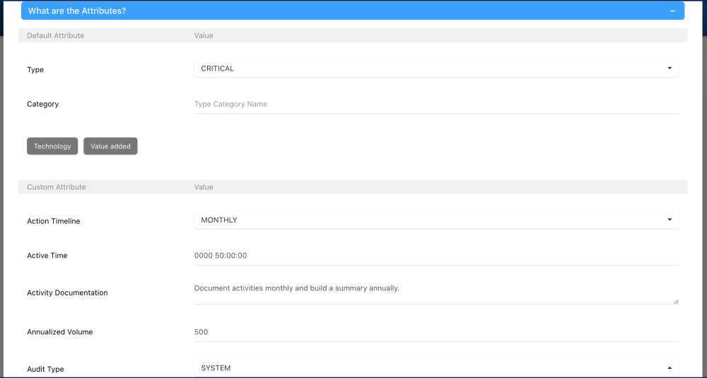 - Attributs personnalisés : Cette section contient les attributs définis par l’utilisateur, spécifiques au type sélectionné. Cette structure garantit une meilleure organisation et une identification plus facile des attributs.