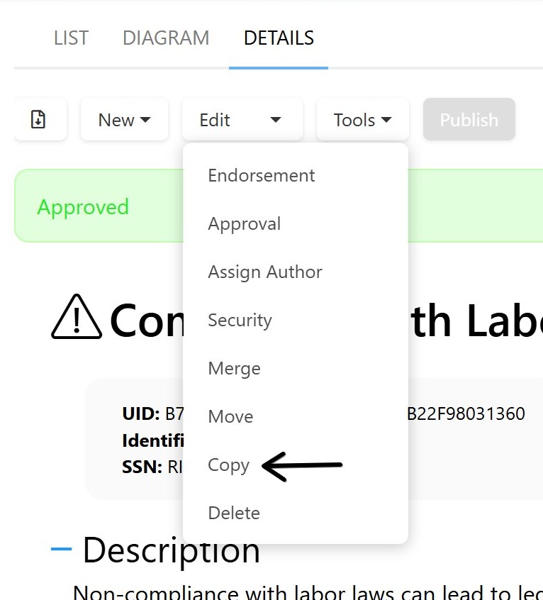 The Copy function lets you duplicate an existing object. This creates an exact copy, including all associations and critical details. Use it to rapidly build content without starting from scratch.