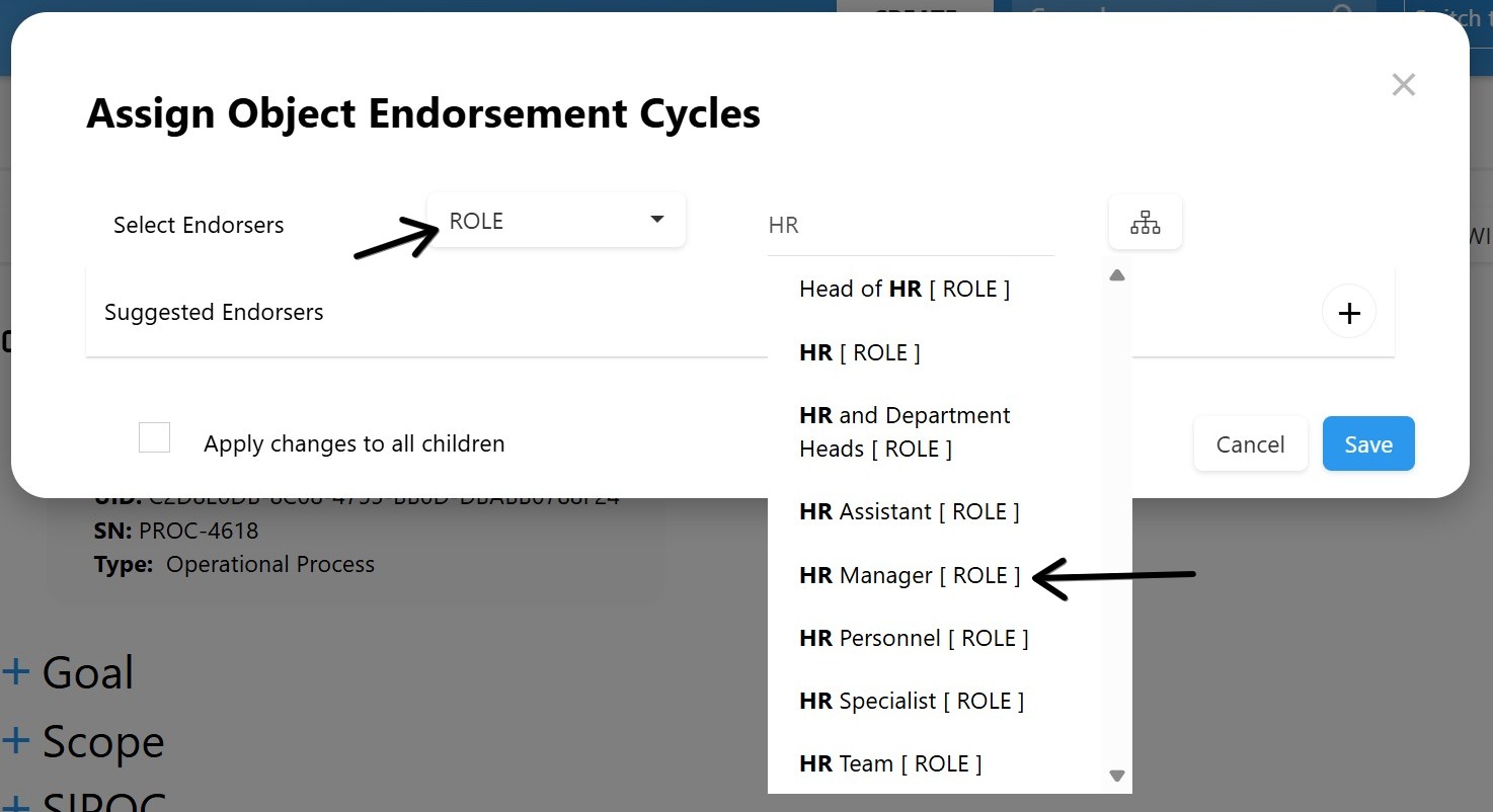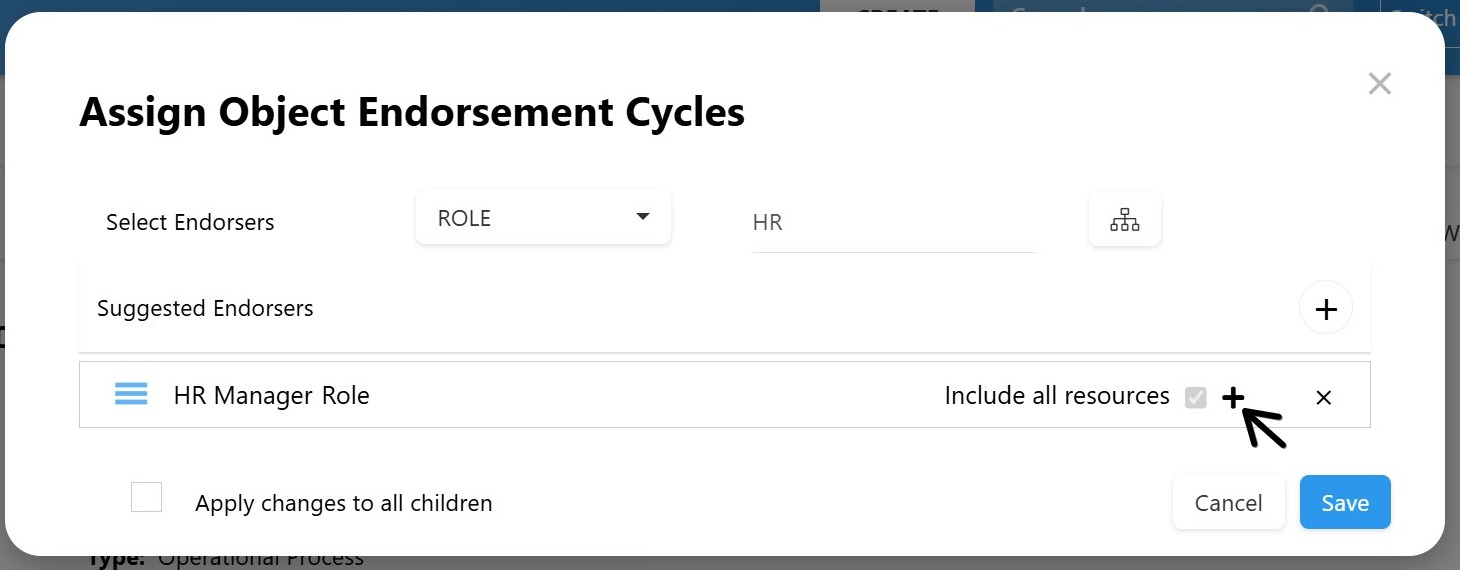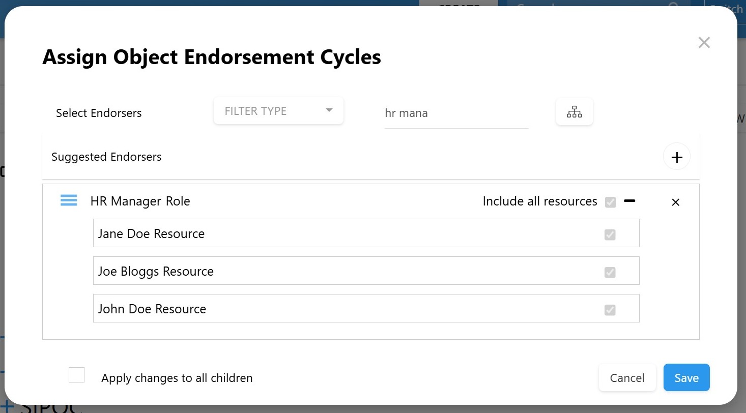 - Filter the suggestions for Resources, Roles, or RASCI-VS (e.g., the object’s assigned Accountable user(s) will be endorsers)