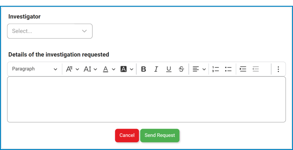 - Send Request: A button for sending the investigation request to the assigned investigator.