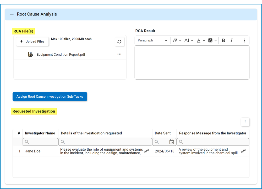 - When the investigation is submitted, any related files will be automatically integrated into the Execute Root Cause Investigation and Create AI form, populating the RCA File(s) attachment field. Additionally, an overview of the investigation exchange will be presented in the Requested Investigation grid.