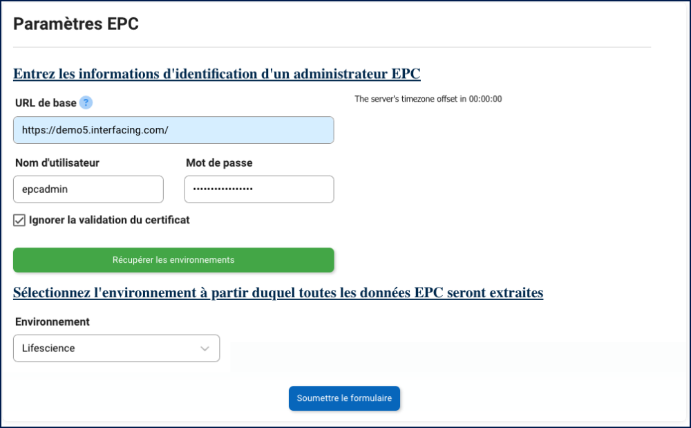 - Bouton Récupérer les Environnements : Ce bouton permet aux utilisateurs de récupérer la liste des environnements depuis le serveur EPC sélectionné.