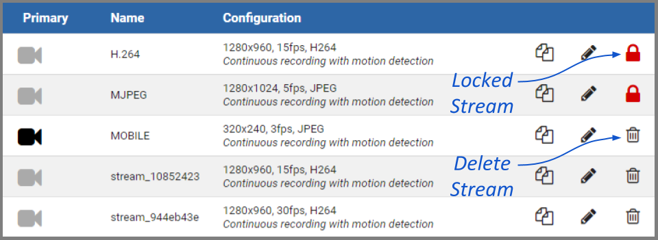 - To remove a single camera stream, go to the Streams List for a given camera and identify the stream you want to delete.