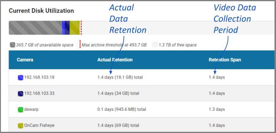 The Actual Retention column shows how many days worth of video is being stored per camera. It also includes how much disk space each camera is consuming. The Retention Span column shows the number of days over which the video files have been recorded. This data point is especially helpful for those cameras that are set to record only when motion is detected. (For example, look at the “dewarp” camera above. At first glance, the actual retention reading might cause concern. The Retention Span confirms that the system has been monitoring the camera for about the same amount of time as the other cameras.)