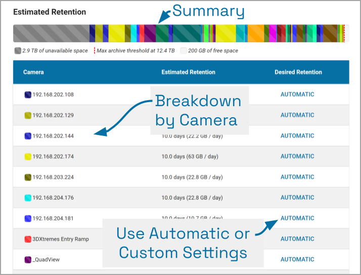 At the top of the Estimated Retention section, Orchid Core VMS displays a summary of estimated server space usage. Use the cursor to hover over the colored regions of the summary graphic to view the estimated server space usage for each camera.